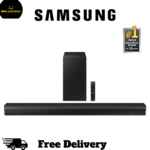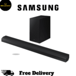 Samsung HW-B650D 3.1ch Soundbar 5.1 DTS DOLBY offers captivating 3D surround sound with Dolby Digital 5.1 capability and DTS Virtual:X. It features a built-in center speaker for enhanced dialogue clarity and includes a powerful subwoofer for intense bass.